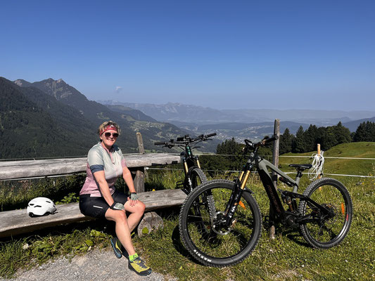 Wir starteten so gegen 09:00 Uhr vom Parkplatz in Nenzing zur Tour Richtung Bürserberg. Nach ein paar Metern durchs Dorf ging es stetig Aufwärts. Landschaftlich eine schöne Tour. Jedoch die geforderten Höhenmeter forderten schon einiges ab, trotz E-Bike. Eine wohlverdiente Rast machten wir auf Furkla Alpe. Danach ging die Tour weiter, am Restaurant Frööd vorbei, und dann runter wieder Richtung Nenzing. Abschluss im Gastgarten des Gasthof Rössle in Nenzing mit Aperol und einem feinen Schnitzel.